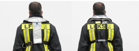 Abb. 2 Rettungswesten in Kombination mit einem Atemschutzgerät. Die linke Tragweise ist nicht zulässig