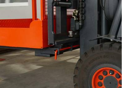 Die Arbeitsbühne muss so am Flurförderzeug befestigt werden können, dass sie sich nicht in Gabellängsrichtung verschieben kann. Dies geschieht zweckmäßigerweise durch eine formschlüssige Verbindung hinter dem Gabelrücken oder dem Gabelträger, z.B. mit Hilfe von Bügeln, Klinken, Haken, Ketten, Bolzen oder einsteckbaren Stangen mit Sicherungsmöglichkeiten gegen ein unbeabsichtigtes Lösen.