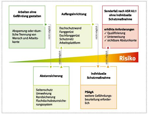 Abhängig von der Absturzhöhe und der Art und Lage des Verkehrswegs oder Arbeitsplatzes sind Schutzmaßnahmen gegen Absturz erforderlich ( Tabelle 2), siehe auch ArbStättV und ASR A2.1 "Schutz vor Absturz und herabfallenden Gegenständen, Betreten von Gefahrenbereichen"