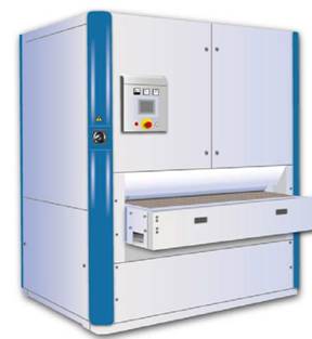 Lattenrost des Auflagetischs durch geschlossene Platte ersetzt. Am Bandeintritt (linke Umlenkung) ist ein Trichter angebracht, der dicht an den Tisch heranreicht. Am Bandaustritt ist die Öffnung im Gehäuse, soweit möglich, geschlossen. Durch eine Leiste im Bereich der Umlenkstelle mit geringem Abstand zum Schleifband werden Wirbel erzeugt, die das Band reinigen. Der seitliche Abstand zwischen Umlenkrolle und Gehäuse ist abgedichtet. An der rechten Rolle wird ein Erfassungselement mit Stutzendurchmesser von 120 mm angebracht. Diese Maßnahme ist bei Maschinen mit einem Absauganschlussdurchmesser von weniger als 160 mm zwingend erforderlich. | angetriebene Rolle: 160 mm nicht angetriebene Rolle: 100 mm Gesamtanschluss: 200 mm |
