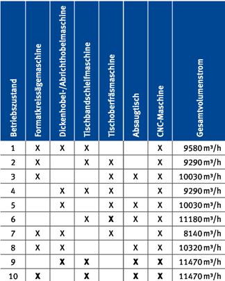 | Tischbandsäge- maschine 6) | Tischeinlage mit Bohrungen und Optimierung des Erfassungselements unter dem Tisch | Variante a): 120 mm | 20 m/s | 820 m3/h |