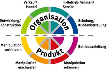 In diesem Kapitel sind die herstellerspezifischen organisatorischen und technischen Maßnahmen aufgeführt, die Voraussetzung sind für eine umfassende Berücksichtigung der Manipulationssicherheit von Maschinen (siehe Abbildung 1). Die genannten Maßnahmen werden in der Checkliste in Anhang II konkretisiert (zur Validierung siehe Kapitel 3).