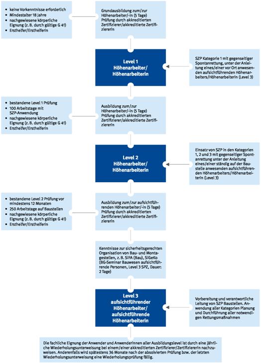 Ausbildung zum Erwerb der nachfolgend aufgeführten theoretischen und praktischen Fähigkeiten und Kenntnisse für die Durchführung und Überwachung der Anwendung von SZP (Höhenarbeiten) nach Level 1 und 2, ggf. Level 3:
