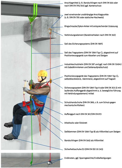 Diese Information konkretisiert u. a. die Bestimmungen der Betriebssicherheitsverordnung für die Anwendung von Zugangs- und Positionierungsverfahren unter Zuhilfenahme von Seilen, insbesondere den § 14, die allgemeinen Mindestanforderungen und die besonderen Vorschriften der Ziffer 3 Anhang 1 sowie die Bestimmungen der TRBS 2121-3 "Gefährdungen von Personen durch Absturz - Bereitstellung und Benutzung von Zugangs- und Positionierungsverfahren unter Zuhilfenahme von Seilen".