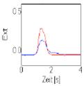 | Abb. 2 Arsen 100 ppb Mehrelementstandard (rot: Analytsignal, blau: Untergrundsignal) | Abb. 3 Arsen 100 ppb Mehrelementstandard mit 500 ppm Tantal-Dotierung (rot: Analytsignal, blau: Untergrundsignal) |