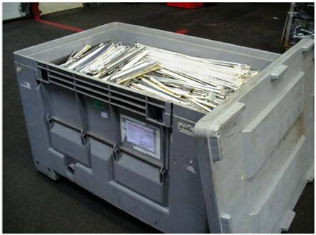 Nach der Demontage werden die Wertstofffraktionen einschließlich der mit Leuchtmitteln gefüllten Behälter bis zum Abtransport durch das Logistikunternehmen in einem Zwischenlager gelagert.
