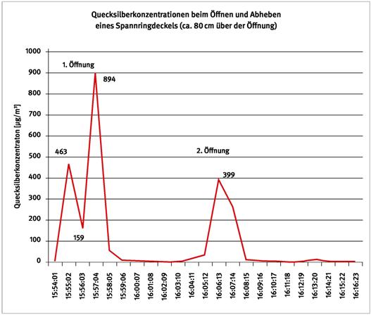 Abb. 6 Quecksilberkonzentration beim Öffnen eines Bruchbehälters mit Glasbruch - vertikal Abheben des Spannringdeckels nach oben zum Einfüllen von Glasbruch