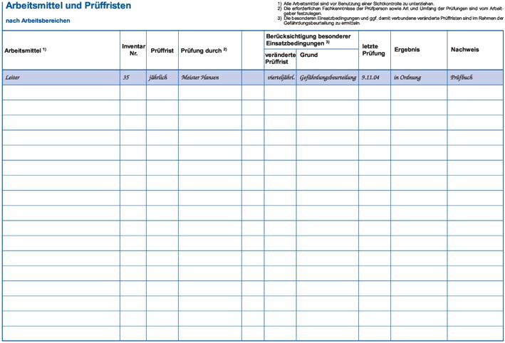 In der Gefährdungsbeurteilung legt der Arbeitgeber eigenverantwortlich Art, Umfang und Fristen erforderlicher Prüfungen der verwendeten Arbeitsmittel fest ( BetrSichV). Zur Festlegung kann er die einschlägigen Unfallverhütungsvorschriften heranziehen. Weitere Hinweise befinden sich in den technischen Regeln für Betriebssicherheit, in Regelwerken der gesetzlichen Unfallversicherungsträger und in Herstellerinformationen. Besondere Vorschriften gelten für überwachungsbedürftige Anlagen ( BetrSichV).
