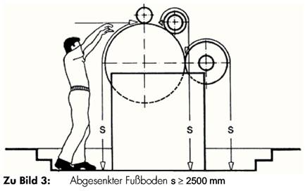 Siehe § 7 Abs. 2 der Unfallverhütungsvorschrift "Maschinen der Papierherstellung" (VBG 7r) und DIN 31001-1 "Sicherheitsgerechtes Gestalten technischer Erzeugnisse; Schutzeinrichtungen, Begriffe, Sicherheitsabstände für Erwachsene und Kinder".