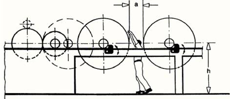 Auflaufstellen sind auch vorhanden an Filztrocknern sowie an Außenwalzen im Maschinenkeller oder -kanal (siehe Abschnitt 2.6). Sind die Sicherheitsabstände eingehalten, befinden sich die Gefahrstellen außerhalb des Arbeits- und Verkehrsbereiches und müssen nicht gesichert werden.
