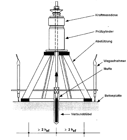 Die für Verbunddübel vorliegenden Erfahrungen gelten für Dübel mit einer Verankerungstiefe in dem in 2.1.1 angegebenen Bereich. Für Verankerungen außerhalb dieses Bereichs ist das vollständige Versuchsprogramm durchzuführen.