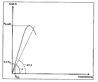 Nu,adh ist für jeden Versuch aus der gemessenen Last/Verschiebungskurve zu ermitteln. Im Allgemeinen wird die Last bei Versagen des Verbundes durch eine signifikante Veränderung der Steifigkeit charakterisiert, siehe Bild 6.1 a). Ist die Veränderung der Steifigkeit bei einer definierten Last nicht so offensichtlich, z.B. wenn die Steifigkeit langsam abnimmt, so ist die Last bei Verlust des Verbundes wie folgt zu ermitteln: