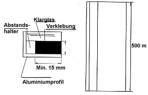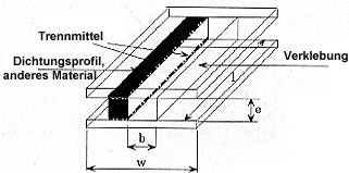 Es wird ein Prüfkörper (siehe Bild 14) mit einer oberen Seite aus Floatglas nach den Spezifikationen des Herstellers der Verklebung hergestellt. Die Verklebung muß den zwischen Glas und Aluminium gebildeten Zwischenraum vollständig und ohne Lufteinschlüsse ausfüllen.