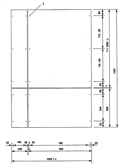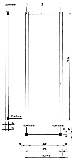 Die Platten werden auf einem aus Holz gefertigten Rahmen montiert, dessen senkrechte Streben (40 ± 1) mm mal (40 ± 1) mm und dessen waagerechte Streben (20 ± 1) mm mal (40 ± 1) mm messen. Die Prüfungsergebnisse für Holzrahmen gelten auch für Metallrahmen. Macht der ETA-Antragsteller eine bessere Leistung bei Verwendung von Metallständern geltend oder verwendet der ETA-Antragsteller keinen Holzrahmen, kann die Prüfung auch mit einem Metallrahmen durchgeführt werden, wobei die (hinsichtlich der Abmessungen und der Dicke der Profile) schwierigste Art von Metallrahmen zu verwenden ist. Werden größere Dicken von Füllmaterial verwendet (siehe unten), müssen die Abmessungen für die Ständer entsprechend größer ausfallen.