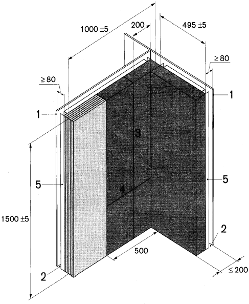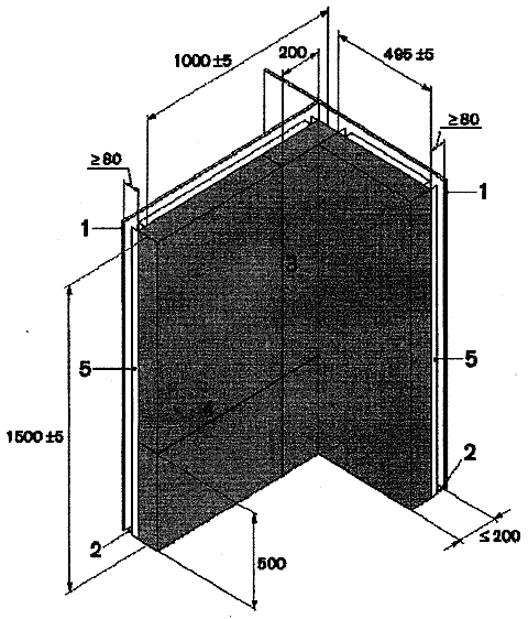 * Die Lage der vertikalen Fuge und des entsprechenden Rahmens hängt von der Dicke des Probekörpers ab, da die Gesamtlänge des langen Flügels laut Festlegung (1000 ±5) mm beträgt und die Fuge bei prüfbereit montierten Flügeln 200 mm von der Ecklinie entfernt liegt.
