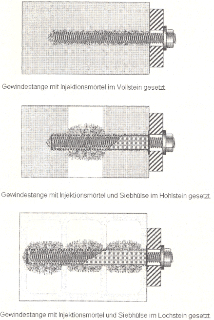 Mauersteine alsHohl- oder Lochsteine haben einen bestimmten Volumenanteil an Hohlräumen, die durch den Mauerstein verlaufen. Für die Beurteilung der Injektionsdübel, die in Hohl- oder Lochsteinen verankert sind, muss zusätzlich angenommen werden, dass der Dübel im Vollmaterial (z.B. Fugen, Vollsteinanteil ohne Lochung) verankert sein kann, daher sind auch Versuche in Vollsteinmauerwerk erforderlich.