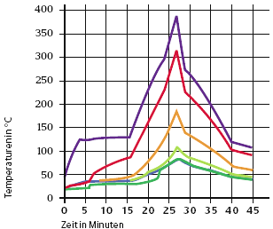 Abb. 7: Temperaturen an der Holzschalung im Dach im Bereich des brennenden Autos