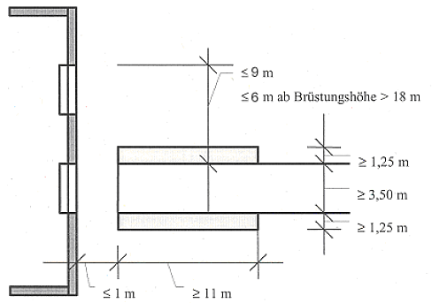 Für Aufstellflächen entlang von Außenwänden muss zusätzlich zur Mindestbreite von 3,50 m auf der gebäudeabgewandten Seite ein mindestens 2 m breiter hindernisfreier Geländestreifen vorhanden sein. Die Aufstellflächen müssen mit ihrer der anzuleiternden Außenwand zugekehrten Seite einen Abstand von mindestens 3 m zur Außenwand haben. Der Abstand darf höchstens 9 m und bei Brüstungshöhen von mehr als 18 m höchstens 6 m betragen. Die Aufstellfläche muss mindestens 8 m über die letzte Anleiterstelle hinausreichen.