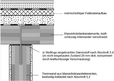 Bei Anschlüssen von hochfeuerhemmenden Wänden mit Brandschutzbekleidung nach Abschnitt 4.2, ausgenommen nichttragende Außenwände, an Decken in Massivholzbauweise ohne Brandschutzbekleidung nach Abschnitt 4.2 sind die umlaufenden Rahmenhölzern der Wände in Abständen von höchstens 500 mm zu verschrauben. Die Rauchdichtigkeit der Fuge ist durch Einlegen eines im nicht eingebauten Zustandes 20 mm dicken Streifens aus Dämmstoffen nach Abschnitt 3.4 herzustellen, der durch eine kraftschlüssige Verschraubung quer zur Fuge zu komprimieren ist.