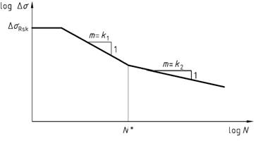 | ΔσRsk(N*) | die Spannungsschwingbreite fürN* Lastzyklen aus der Wöhlerlinie nach Bild 52 (Parameter siehe Tabelle 16 und Tabelle 17) |