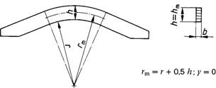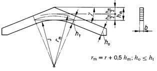 Bei gekrümmten Bauteilen muss der Biegeradius r1 mindestens 200 * a sein. Hierbei istr1 der Biegeradius des Einzelbrettes und a dessen Dicke. Biegeradien zwischen 200 * a und 150 * a sind zulässig, wenn die Brettdicke der Zahlenwertgleichung