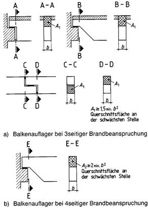 3.2.3.5 Balkenauflager sind so zu bemessen, dass die Querschnittsfläche an der schwächsten Stelle ≥ 2 min.b2 ist (siehe Bild 5b)), wobei min.b der kleinste der gewünschten Feuerwiderstandsklasse zugeordnete Wert nach Tabelle 3, Zeilen 1 bis 12, ist.