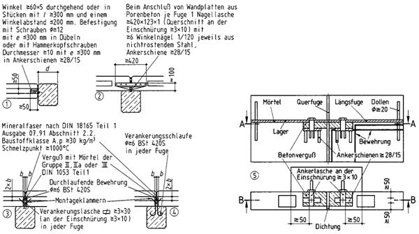 Bild 25: Ausführungsmöglichkeiten 1 bis 5 von Anschlüssen von nichttragenden, liegend angeordneten Wandplatten an Stahlbetonstützen bzw. -wandscheiben; die Ausführungsschnitte 1 bis 4 sind mit Wandplatten aus Porenbeton dargestellt