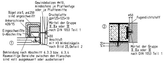 4.8.6.3 Stahlstützen sind nach den Angaben der Abschnitte 6.3.3 oder 6.3.4 3seitig - bei Eckstützen 2seitig - für ≥ F 90 zu ummanteln. Darüber hinaus sind die raumseitigen Flächen zwischen den Flanschen auszumauern oder auszubetonieren. Die Bekleidungen sind durch Bügel, Durchmesser ≥ 5 mm, in Abständena ≤ 250 mm nach den Angaben der Bilder 27, Ausführungsmöglichkeiten 1 und 2, sowie 28, Ausführungsmöglichkeit 1, zu sichern; dabei sind die Bügelenden am wandseitigen Stützenflansch anzuschweißen oder durch Umbiegen zwischen den Flanschen zu verankern.