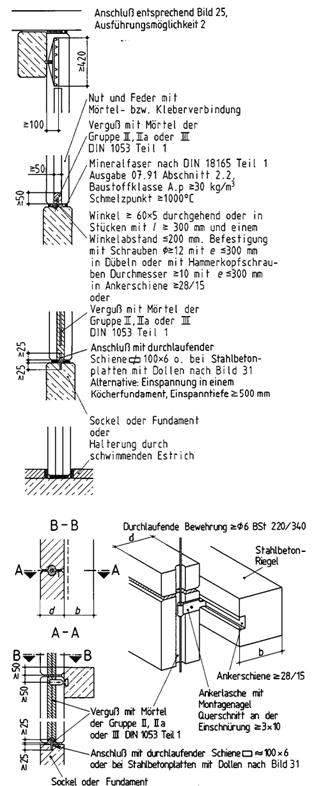 4.8.7.1 Anschlüsse von nichttragenden, stehend angeordneten Wandplatten aus Stahlbeton nach DIN 1045 oder bewehrtem Porenbeton an angrenzende Stahlbeton-Riegel- und -Deckenscheiben bzw. Sockel- und Fundamentteile können z.B. nach den Angaben von Bild 30 ausgeführt werden.