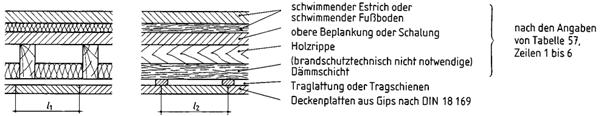5.3.2.3 Holzbalkendecken ohne schwimmenden Estrich oder schwimmenden Fußboden mit 2lagiger oberer Schalung müssen nach den Angaben von Tabelle 60 ausgeführt werden.