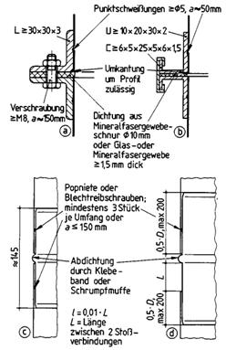 Auf Lüftungsleitungen mit Kantenlängen oder Durchmesser über 630 mm ist die Dämmschicht allseitig zusätzlich auf der Stahlblechleitung zu befestigen: Auf die Leitungswandung müssen Gewindebuchsen M 5 elektrisch aufgeschweißt werden. Die Schweißstellen sind nachträglich durch Kaltverzinkung gegen Korrosion zu schützen. In die Buchsen sind Stifte einzuschrauben. Die Lagen der Dämmschicht sind mit Federplättchen bzw. mit Drehklipps wahlweise zu sichern (nach den Angaben in Bild 79 sowie der zugehörigen Stückliste). Alternativ hierzu kann die zweite Lage mit Mattenhalterhaken befestigt werden. Bei durchgehenden Befestigungsstiften ist ein nichtrostender Stahl mit der Werkstoffnummer 1.4301 nach DIN 17440 zu verwenden.