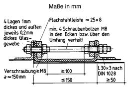 8.4.6.4 Der Rahmen der Verglasung muss sich aus einem Träger- und einem Abdeckrahmen zusammensetzen, die mit Hilfe von Stahlschrauben M8 x 20 in Abständen von etwa 350 mm miteinander verbunden werden. Der Trägerrahmen muss aus Stahlprofilen L 45 mm x 45 mm x 5 mm und der Abdeckrahmen aus Stahlprofilen L 40 mm x 40 mm x 4 mm zusammengesetzt sein, die jeweils in den Rahmenecken miteinander stumpf verschweißt sein müssen (siehe Bild 76).