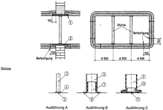 Für Lüftungskanäle aus Wänden nach Abschnitt 4 gilt Abschnitt 8.5.4 sinngemäß, wenn die Wände auf dem Erdboden oder auf massiven Bauteilen aufliegen; die obere Begrenzung der Kanäle ist durch Decken nach den Abschnitten 3.4 bis 3.11 herzustellen.