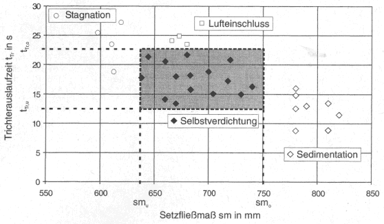 (6) Befindet sich mindestens ein Wert nicht im Fenster, wird der Beton verworfen oder es müssen geeignete Korrekturmaßnahmen (z.B. Fließmittelnachdosierung) eingeleitet werden, um den Selbstverdichtenden Beton wieder in den Verarbeitbarkeitsbereich zu bringen.
