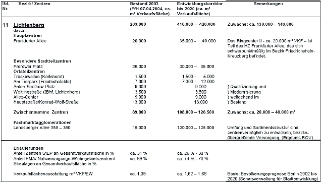 ... Bei einem Bestand von ca. 4,1 Mio. m2Verkaufsfläche ist bis zum Jahr 2020 gesamtstädtisch ein realer Zuwachs von per Saldo etwa 400.000 bis 600.000 auf ca. 4,5 bis 4,7 Mio. m2 anzunehmen. ... Der hohe Anteil der Haushalte ohne eigenen Pkw und die (unter-)durchschnittliche Kaufkraft in vielen Stadtquartieren erfordern ein kleinteiliges Versorgungsnetz. Dazu gehören insbesondere die Ortsteilzentren und die Standorte der Nahversorgung mit Gütern des täglichen Bedarfs. ... Die Nahversorgungszentren sind jedoch nicht Gegenstand der gesamtstädtischen Konzeption dieses Stadtentwicklungsplans, ihre Entwicklung zu steuern ist in erster Linie Aufgabe der Bezirke.