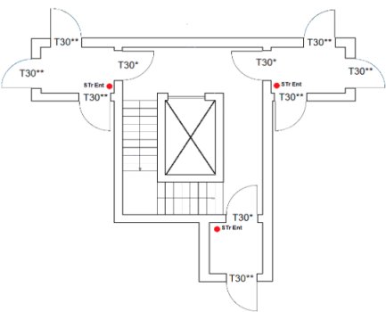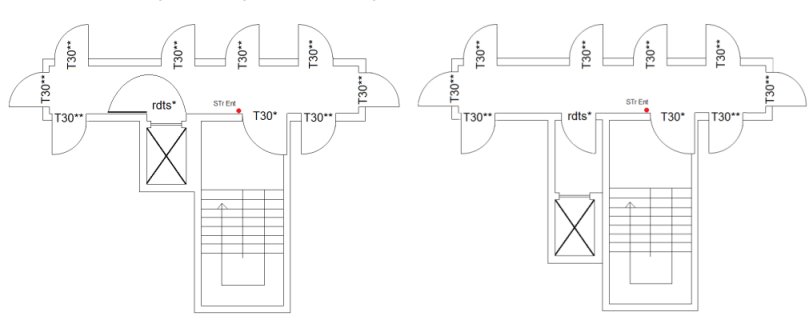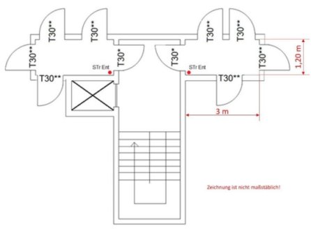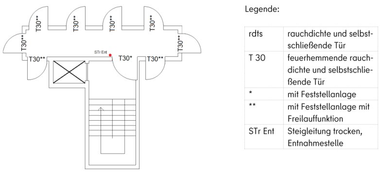 Der innenliegende Sicherheitstreppenraum weist Türöffnungen zu zwei oder drei notwendigen Fluren je Geschoss auf: