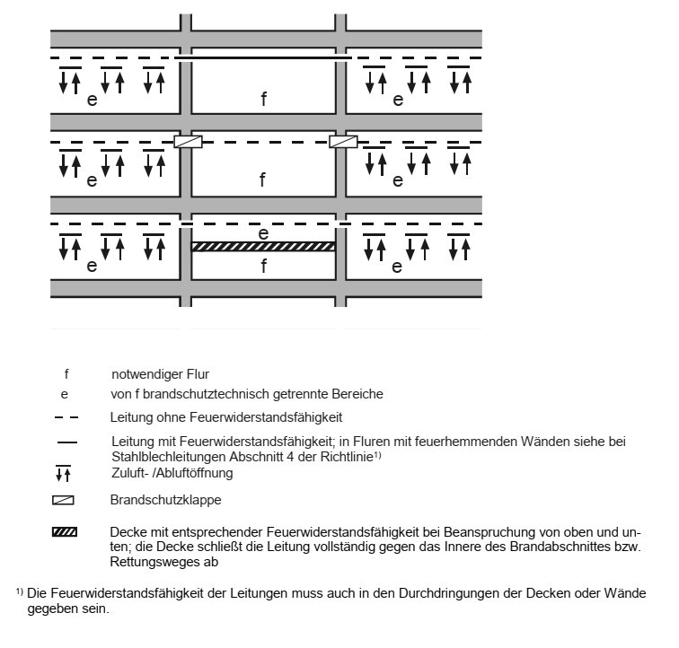 In notwendigen Fluren mit feuerhemmenden Wänden genügen Lüftungsleitungen aus Stahlblech, ohne Öffnungen, mit Abhängern aus Stahl, vgl. Bild 3.1 und Bild 3.2. Dabei darf die Lüftungsleitung nur Bereiche verbinden, die brandschutztechnisch nicht voneinander getrennt werden müssen.