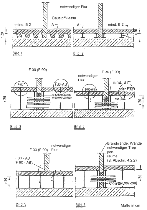 In notwendigen Treppenräumen, in Räumen zwischen notwendigen Treppenräumen und dem Ausgang ins Freie sowie in notwendigen Fluren muß darüber hinaus auch der Raumabschluß (einschließlich Revisions- und Nachbelegungsöffnungen) und die Temperaturbegrenzung, nach DIN 4102-2, gewährleistet sein; die Bodenplatten und die Ständer müssen feuerhemmend sein und in den wesentlichen Teilen aus nichtbrennbaren Baustoffen (F 30 - AB) bestehen (Bild 3).
