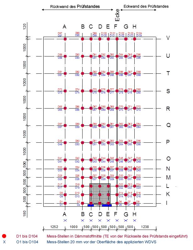 Für die Versuchsdurchführung sind der Prüfstand und das applizierte WDVS mit Thermoelementen (Typ K gemäß DIN EN 60684-1:2014-07, Ø 3 mm) gemäß Abbildung 2 auszurüsten.