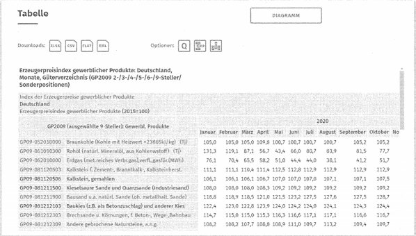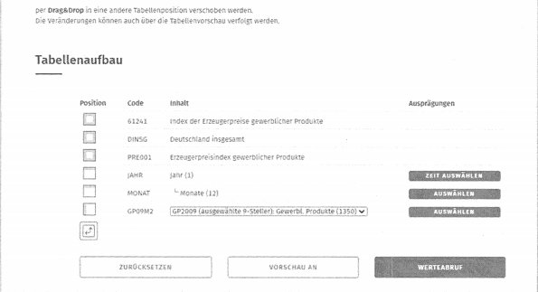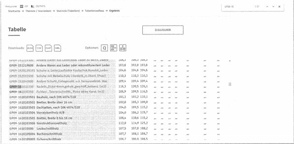 Neben den langen Reihen der Fachserie 17 Reihe 2 bietet das statistische Bundesamt auch den Zugriff auf die Genesis-Online Datenbank an, die teilweise eine weitere Gliederungsebene innerhalb einer bestimmten GP-Nummer [z.B. 161010350 (Nadelschnittholz)] enthält. Dadurch ist eine genauere Verfolgung der Preisentwicklung möglich.