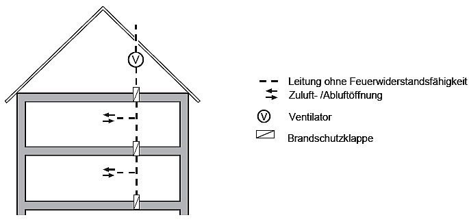 und jeweils Brandschutzklappen bei Abzweigen in den Geschossen an den Durchtrittsstellen durch die Schachtwand bzw. an den Anschlussstellen der Lüftungsleitung.