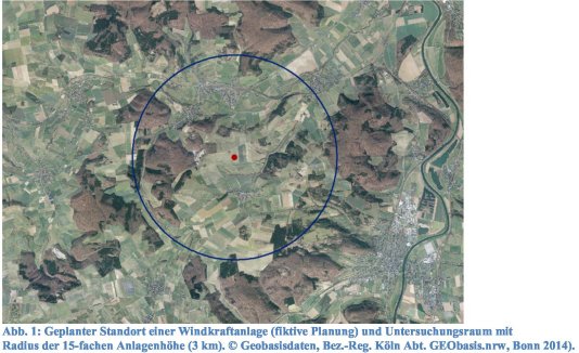 Der Untersuchungsraum ist der Bereich um die Windenergieanlage mit dem Radius der 15- fachen Anlagenhöhe. Der Radius des Untersuchungsraumes beträgt also 15 * 200 m = 3 km (Abb. 1).