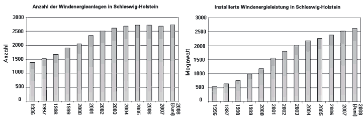 Mitte der 90er Jahre wurde auf der Basis von Kreiskonzepten die Windenergienutzung in Schleswig-Holstein erstmalig landesplanerisch geregelt. Bis dahin waren bereits ca. 1.000 Anlagen mit einer Leistung von insgesamt 315 MW installiert (1995). Zu dieser Zeit hatte die Landesregierung laut Energiekonzept das Ziel angestrebt, 25% des Strombedarfs bis 2010 aus Windenergie zu decken. Danach hätten bis 2010 ca. 2.000 Windenergieanlagen mit einer Nennleistung von insgesamt 1.200 MW gebaut werden müssen. Dieses Ziel wurde bereits Ende 2001 überschritten; 2.305 Anlagen produzierten damals bereits ca. 1.343 MW. Das neue Ziel ist nun, 50 % des schleswigholsteinischen Strombedarfs - sowohl onshore als auch offshore - aus Windenergie zu decken. Bis Ende 2005 waren in Schleswig-Holstein 2.740 Windkraftanlagen mit einer Gesamtleistung von 2.274 MW und Ende 2006 2.717 Windkraftanlagen mit einer Gesamtleistung von 2.391 MW installiert (DEWI 2005 und 2006).