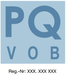 Für den schriftlichen Verweis der Unternehmen auf die Eintragung im Amtlichen Verzeichnis PQ-VOB des "Vereins für die Präqualifikation von Bauunternehmen e. V." bei Veröffentlichungen oder im Schriftverkehr, verpflichten die PQ-Stellen die Unternehmen, das beim Patent- und Markenamt als Kollektivmarke eingetragene Vereinslogo nach der dort hinterlegten Zeichensatzung, zusammen mit der Registriernummer, wie nachfolgend dargestellt zu verwenden.