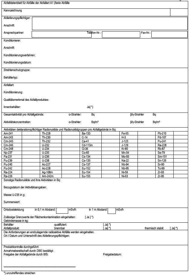 Der Nachweis über die Ablieferung von radioaktiven Abfällen erfolgt anhand der Antragsunterlage gemäß Anlage 1. Bei jeder Anlieferung von radioaktiven Abfällen aus dem Besitz des Abfallerzeugers ist für jeden Abfallbehälter ein Antragsformular zu verwenden, das in folgenden vier Ausfertigungen einzureichen ist: