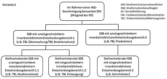 Im deutschen Strahlenschutzrecht werden eine klare Zuweisung von Aufgaben und Pflichten und eine Übertragung der Verantwortung im Strahlenschutz vorgenommen. Neben dem Genehmigungsinhaber als Strahlenschutzverantwortlichem übernimmt der Strahlenschutzbeauftragte eigenverantwortlich Aufgaben für den Strahlenschutz in seinem innerbetrieblichen Entscheidungsbereich. Beispiele zu verschiedenen in der Praxis vorhandenen Modellen zur Übertragung von Aufgaben und Pflichten sind in Anlage A-1 gegeben.