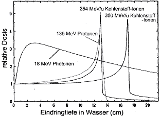 Ionenstrahlen haben auf Grund ihrer physikalischen Eigenschaften gegenüber Photonenstrahlen zwei wesentliche Vorteile für die Therapie von tief liegenden Tumoren. Der erste ist die geringe Dosis im Eingangskanal und der nachfolgende Anstieg der Dosis mit wachsender Eindringtiefe bis zu dem so genannten Bragg-Maximum am Ende der Reichweite und der nach diesem Maximum folgende steile Dosisabfall. Die Lage des Maximums kann in der Tiefe durch eine Veränderung der Energie der Ionen verschoben werden. Dadurch können Tumordosen bei gleich bleibenden Dosen im Eintrittsvolumen erhöht werden, oder umgekehrt, bei gleich bleibenden Tumordosen die Dosen im Normalgewebe verringert werden (siehe Abbildung 1) .