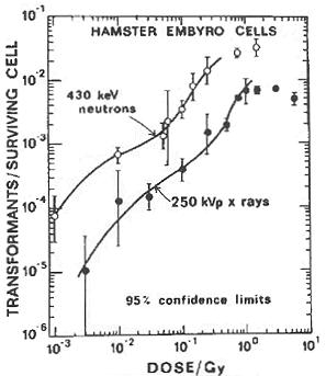 An der Columbia University wurden von Borek et al. [BOR 84] umfangreiche In-vitro-Untersuchungen von neoplastischen Zelltransformationen an Embryonalzellen des syrischen Hamsters (SHE-Zellen) nach Bestrahlung mit 250 kV-Röntgenstrahlen bzw. 430 keV-Neutronenstrahlen bis herunter zu 1 mGy Neutronendosis durchgeführt (s. Abb. 4.3). Daraus ergab sich ein RBWM von etwa 15.