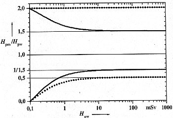 Diese unteren Messbereichsgrenzen werden daher im Folgenden als kleinste anzugebende Werte Hp0interpretiert. Bei diesen Werten ist eine relative Messabweichung von ± 100% vom wahren Wert Hp0erlaubt. Mit zunehmenden Messwerten der Personendosis nimmt die maximal zulässige relative Messabweichung gemäß der Bedingung (1) ab, so dass bei hohen Werten (d.h. für Hpw >> Hp0 ) der Quotient Hpm/Hpw nur noch im Intervall von 1/1,5 bis 1,5 liegen darf: