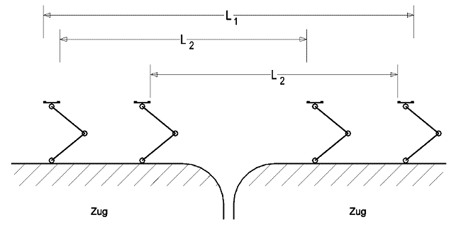 Bei einer Anordnung nach Bild H.2 ist die Schutzstrecke länger als der größte, 400 m messende Abstand zwischen zwei anliegenden Stromabnehmern eines interoperablen Zugs.